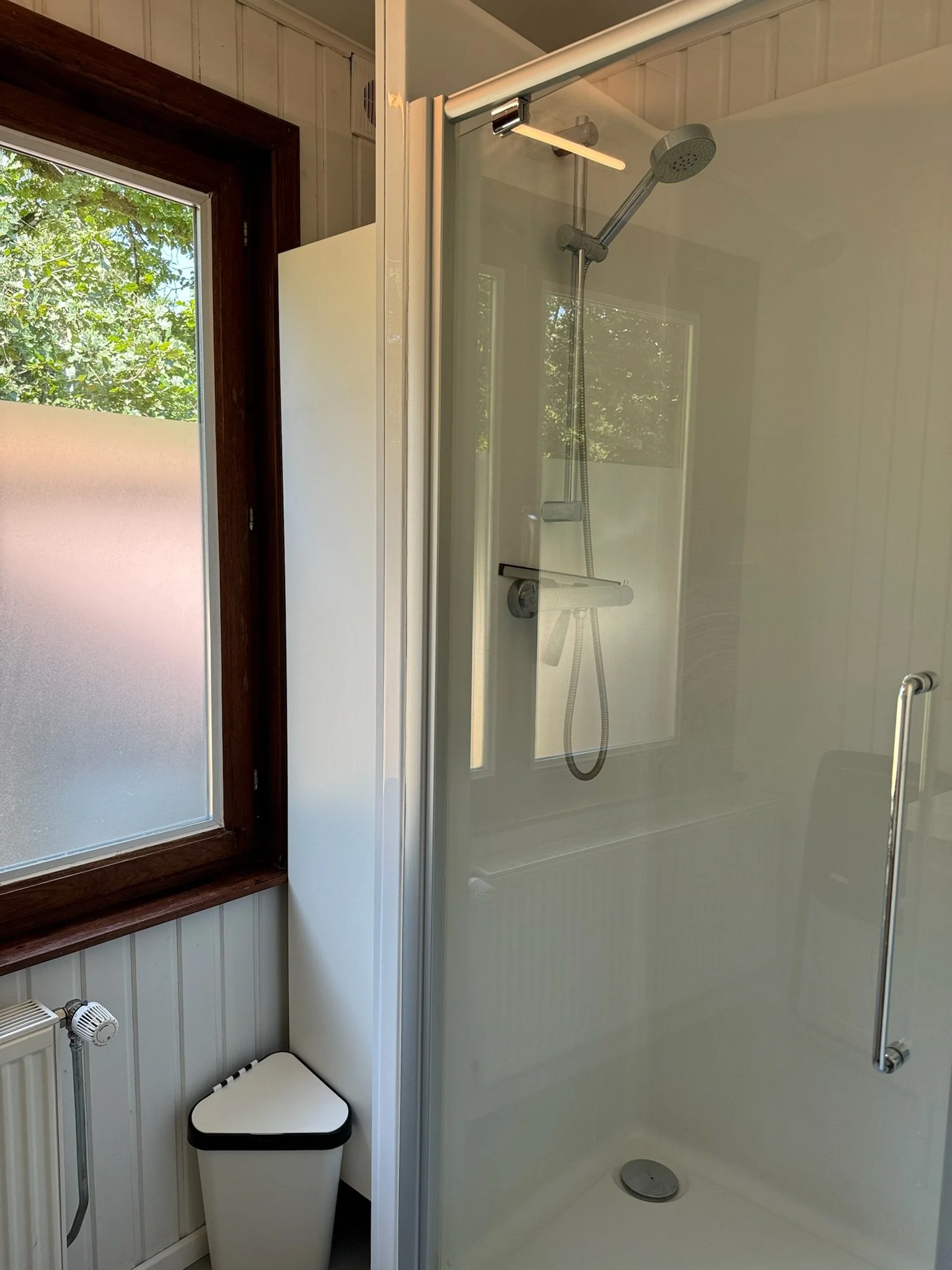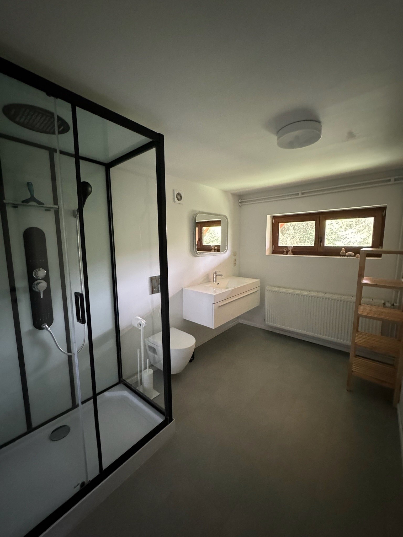 Op het gelijkvloers bevindt zich een badkamer met 2 douchecellen. Beneden vind je een ruime badkamer met regendouche. Op alle 3 verdiepingen is er een toilet. De 2 kamers boven hebben een eigen lavabo.